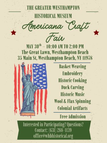 Join us this Spring for our Americana Craft fair on the Great Lawn! Join us in May on the Great Lawn in Westhampton Beach and get taken back in time to Colonial America. See the different crafts and activities that Americans of the time did, and even grab some to bring home. Interested in participating? Contact us at (631) 288-1139 or email us at office@whbhistorical.org.